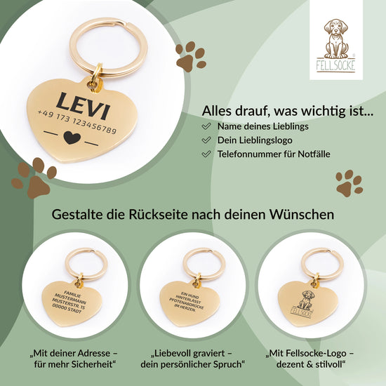 💛 Sichere und schmücke deinen Vierbeiner – mit der personalisierten Herz-Hundemarke in Goldfarben von FELLSOCKE!