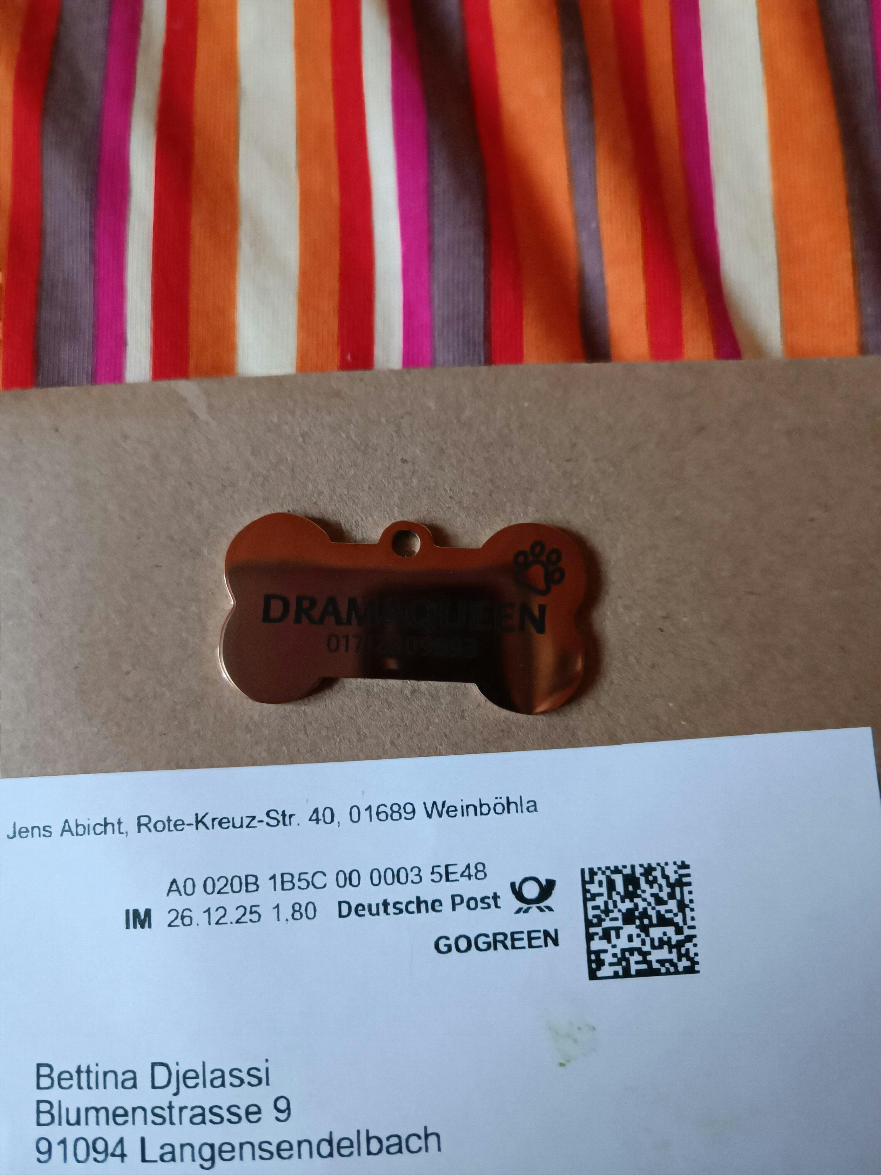 Stilvoll und einzigartig: Unsere Hundemarke in Roségold und Knochenform bietet nicht nur Schutz, sondern auch ein modisches Statement für deinen Hund. Die edle roségoldfarbene Oberfläche und die individuelle Gravur machen diese Marke zu etwas ganz Besonderem.