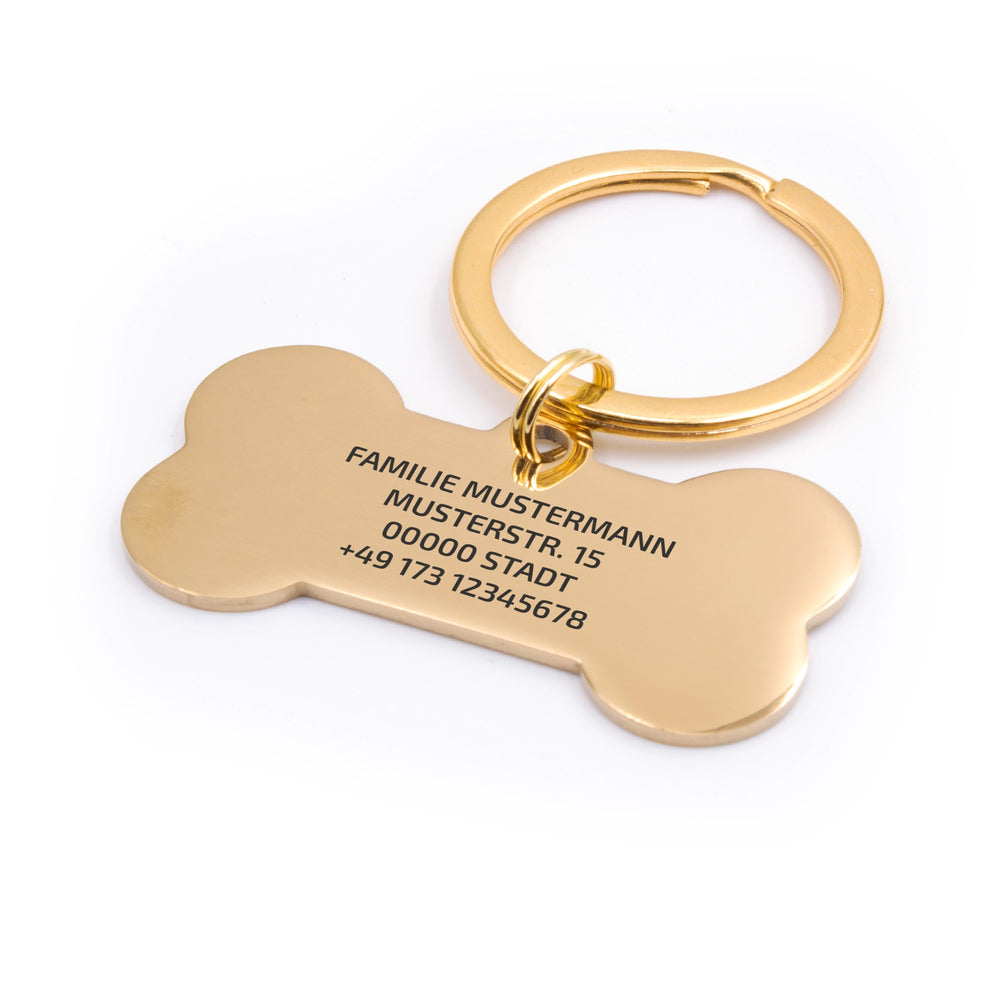 Verleihe deinem Hund ein besonders edles Accessoire: Unsere goldfarbene Hundemarke in Knochenform kombiniert robuste Materialien mit einem eleganten Design. Die Marke aus Edelstahl ist wahlweise in 40 × 21 mm oder 50 × 28 mm erhältlich und wird individuell für dich graviert.