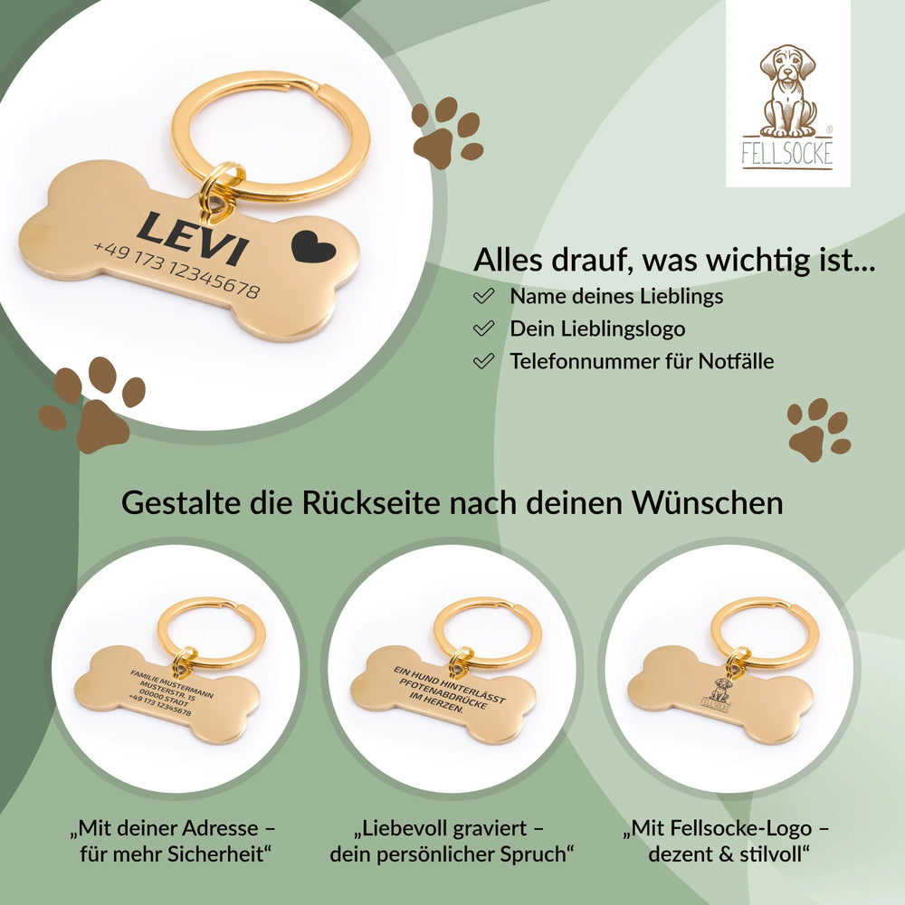 Setze auf Sicherheit und Stil – mit der goldfarbenen personalisierten Hundemarke in Knochenform von FELLSOCKE.